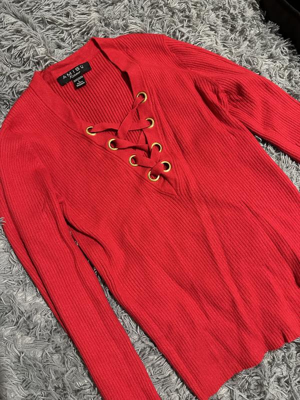 Свитер в рубчик со шнуровкой в зоне декольте. Продаю только потому что на меня большой. Размер м-л