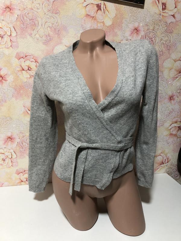 Кофтина на запах. 100%шерсть. Указан размер М, но несколько маломерит, лучше на S. Очень теплая. Не длинная.
