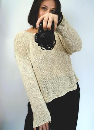 Надзвичайно комфортний светр лонгслів із 100% натурального шовку! Модель светра оверсайз, стиль кежуал - пряма широка посадка, відкрита горловина півколом, рукава прямі подовжені. В'язка - крупна лицьова гладь, виглядає стильно і дещо брутально. Светр в'язаний із цілком натуральної пряжі (не фарбована!) - 100% буретний шовк. Шовк буретний - найменш хімічно оброблене волокно, ідеальна нитка для створення виробів для носіння на голе тіло, для алергіків і всіх любителів натуральних і благородних матеріалів. Це справжня знахідка для шанувальників натуральної та екологічно чистої пряжі. Вона м'яка і приємна на дотик, гіпоалергенна та має високі гігроскопічні властивості, завдяки чому светр абсолютно комфортний і в прохолодну, і в теплу погоду. Стиль светра мінімалістичний. Виглядає ефектно як самостійно, так і з яскравими аксесуарами та прикрасами. Колір натуральний беж (нефарбований шовк). Дуже простий в доглялі, можна прати в машині в теплій воді до 35°С в ручному режимі, не віджимати і не сушити в машині. Заміри светра: ширина 58см, довжина 56см, рукав + плече 48см+20см Зв'яжемо з любов'ю для Вашої краси і комфорту!