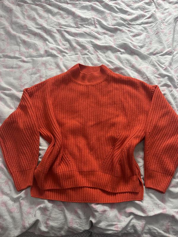 Оранжевый свитер в размере S, подойдет на М. Приятная ткань, красиво садится.