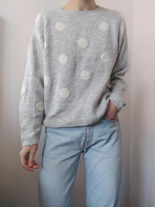 Сірий светр з сумішшю шерсті H&M Дуже м'який, приємний на дотик. 8% шерсть. Стан чудовий Розмір М, підійде і на S Заміри: плечі (опущені) - 52 см, рукав - 49 см, півобхват грудей - 54 см, довжина - 57 см. Одягнуто на розмір s
