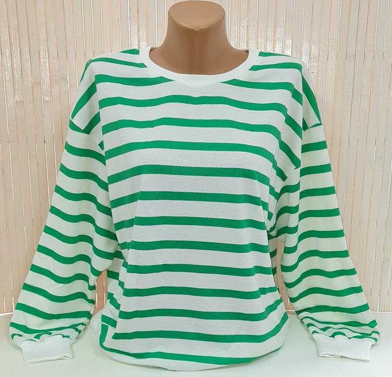 Код товара: 6524.2 Батник женский в полоску больших размеров, трикотажный с круглым воротом, мягкая и приятная к телу ткань. Нижняя часть батника и рукава с манжетом. Производитель: Турция Состав: коттон 95%, эластан 5% Цвет: белый в зеленую полоску Размер: 50-56 (единый размер) Цена: от 1 шт - 499 грн от 5 шт - 365 грн