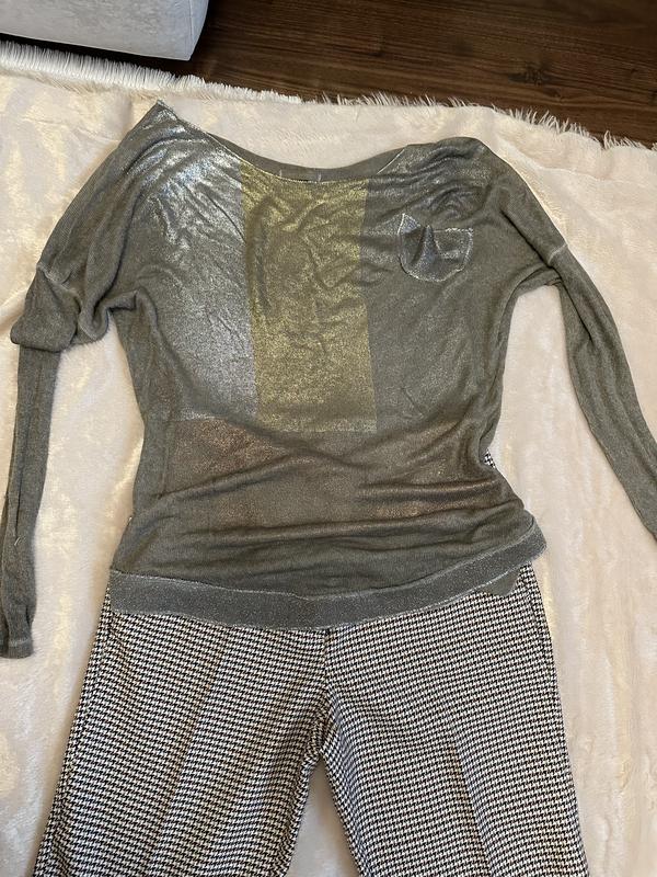 Легкий свитер Италия с блестящим принтом на ткани золото -серебро замеры на фото