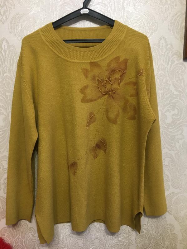 Гарний світер , гірчичного кольору, по бокам розрізи , бірки з розміром немає , є бірка , видно погано , але видно що 50% шерсті. Орієнтуємось по замірам : напівобхват бедр-61,напівобхват грудей -64,довжина-70, рукав-56