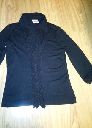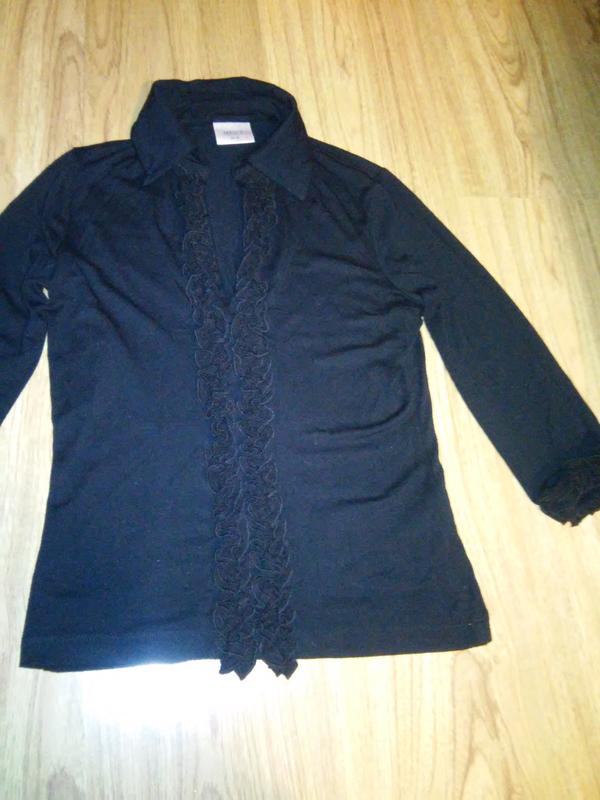 Тонкий черный пуловер с воротничком и узкими рюшами спереди по всей длине,рукав 3/4,тоже с узкими рюшами из эластичной сеточки,размер 12 европейский,материал-вискоза,лайкра.Состояние отличное.