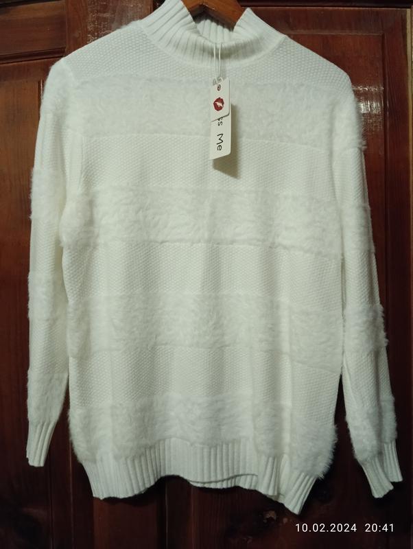 светр білого кольору з вставками альпаки, спокійний стан 106, тягнеться до 130 в грудях і по низу, довжина 64,рукав від шиї67,легка стієчка не здавлює.Светр нарядний, дуже теплий,маю два тому один вирішила продати