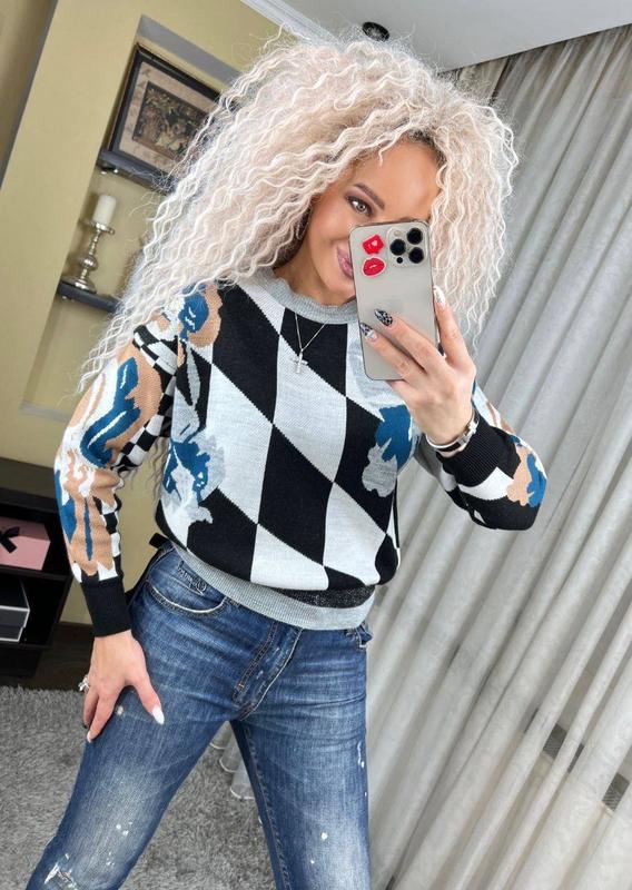 👆Кофта з ромбами та квітами. Код 7786 Розмір універсальний 42/46 Машинна в'язка Країна виробник Туреччина 🇹🇷 ---------------------- 🌹Заміри : Довжина по спинці 50см, довжина рукава від плечового шва 46см, довжина рукава від горловини 62см, напівобсяг грудей в спокійному стані 52см + тягнеться.
