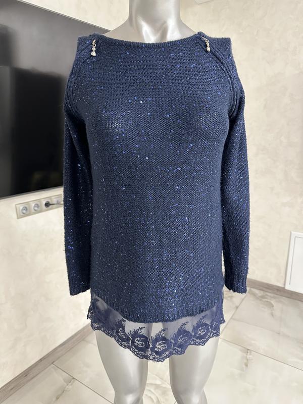 Интересный свитерок с пайетками весь блестит внизу сеточка. Размер указан С/М. Замеры: длина до кружева 60см, кружева 12см, рукав от горла 65см, пог 47см, тянется. Состояние хорошее.