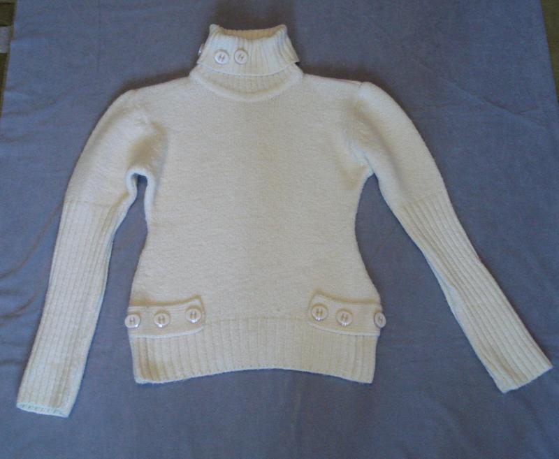 Очень мягкий и теплый свитер молочного цвета. Производство Турция. С браком: с одной стороны над пуговицами есть выпуклость.