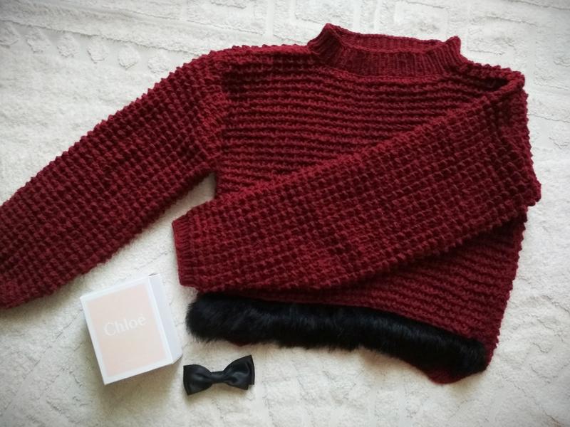Шикарний коротенький светр із широким рукавом кольору марсала, з хутром кролика. Розмір S