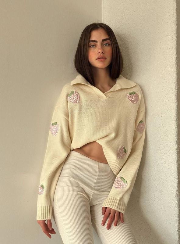 Светр Модель 4198 Бомбезный укороченный свитер с вышитыми шелковыми нитями ягодками Отложной воротник, фактурная вязка на рукавах и по низу свитерика Производитель Турция 🇹🇷 НОГ-50 см Длина-48 см Длина рукава от горловины-70см