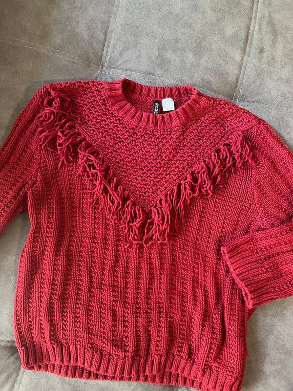 Свитер свободный вишневого цвета с бахромой по груди. Плечо 14 см, по груди 52-70 см, длина 58 см, по ширине 53-71 см, рукав 46 см, спинка 42-56 см)