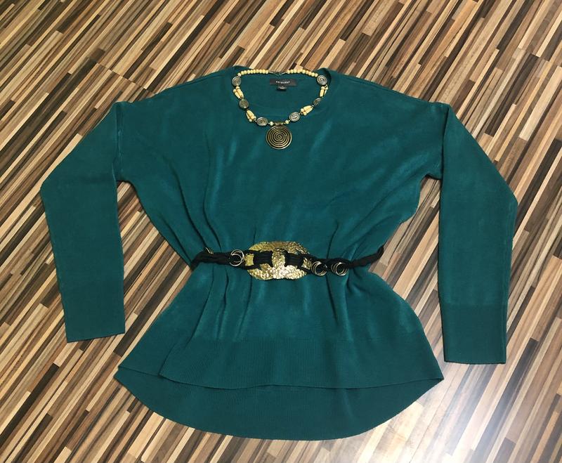 Очень красивый свитер, изумрудного цвета, очень приятный к телу. Фасон впереди короче, спина длиннее. Смотреться хорошо под брюки, юбку прямую , джинсы, лосины.