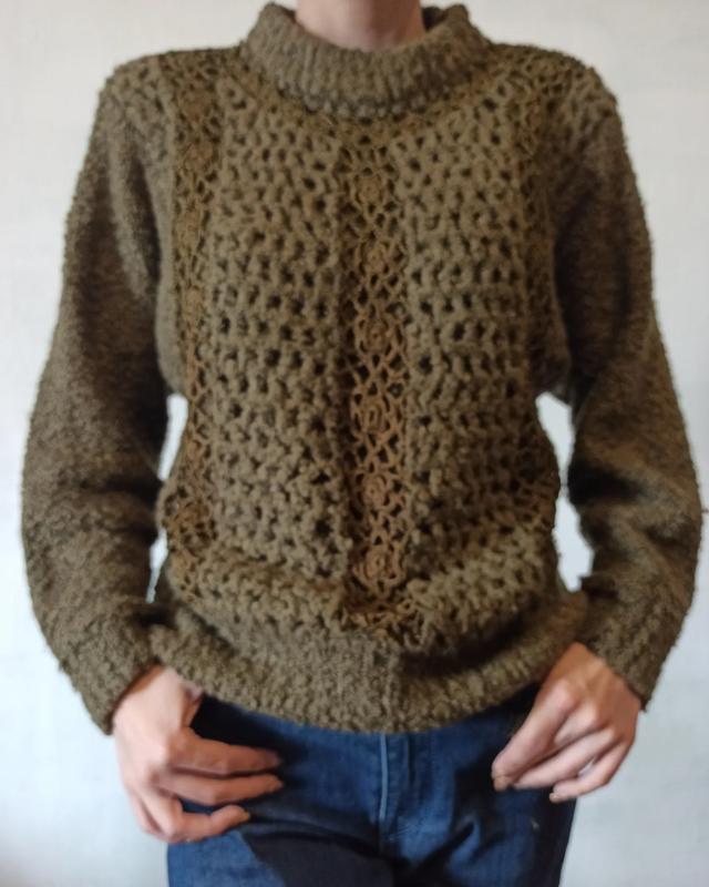 дуже теплий светрик, спереду подвійна в'язка , вишиті вставки. точного складу тканини не вказано. На бірці вказано що у складі вовна