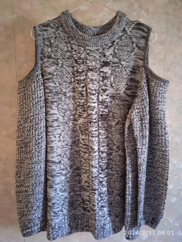 Прикольный свитерок с открытыми плечами очень красиво смотрится. Длина от плеча 72,рукав 53 ширина 64 тянется до 70. Обмена и возврата нет, деньги продавцу на карту.