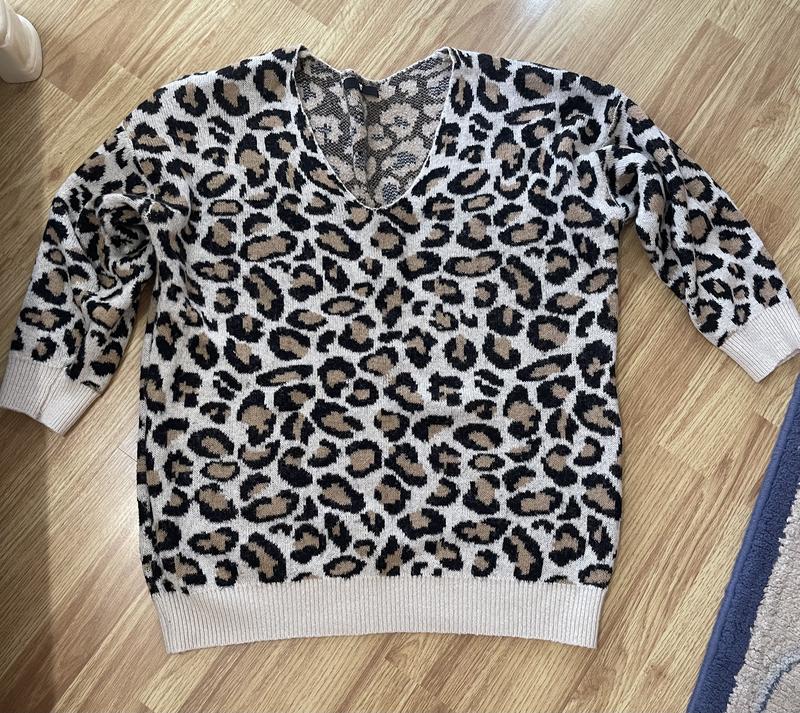 Леопардовий светр йде подовжений розмір Over says. білий в полоску приталиний…Стан чудовий у обох… Вишлю додаткові заміри та фото мої параметри 99 талія 84 зріст 170