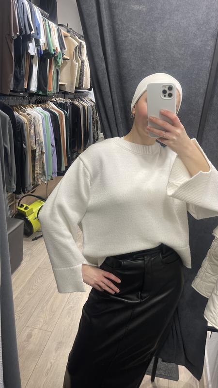 Свитер украинского бренда, очень теплый и классный состав: 40% шерсть 60% акрил, приятный к телу. Стан - красивый. По наборке размер М, но на фото одето на С и он оверсайз, подойдет и на М но будет более стандартного кроя. Цвет приведения как на фото - молочный.