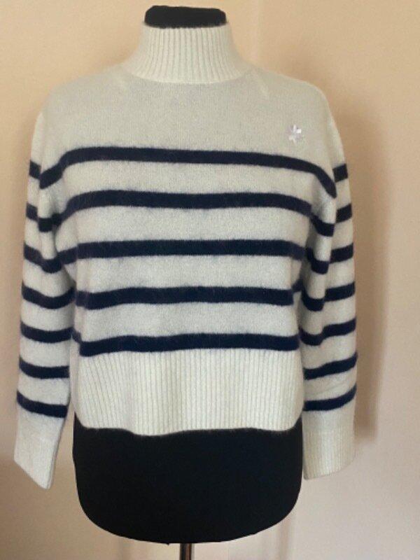 Фірмова, дорога кофта білого кольору з темно - синіми полосками, фасон оверсайз, розмір М вказано, демонстровано на манекені 52 розміру. 30% мохеру в складі, 39% шерсті, 2% еластану, 29% поліестер. Довжина - 55см, плечі - 46см, рукав від плеча - 61см, пог - 58см,півоб'єм низу - 53см.