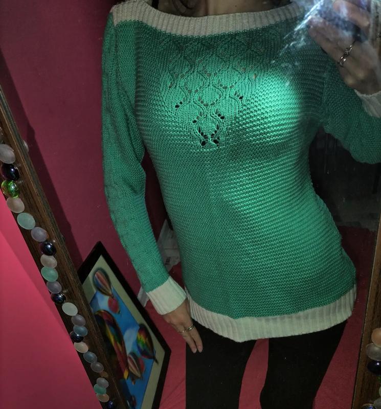 Тип одягу: Светри ✔️ В'язаний светр ✓колір - бірюза з білим ✓розмір - M/L ОГ 88 + - Обхват знизу 92 + - Довжина 58 Довжина рукавчика 58
