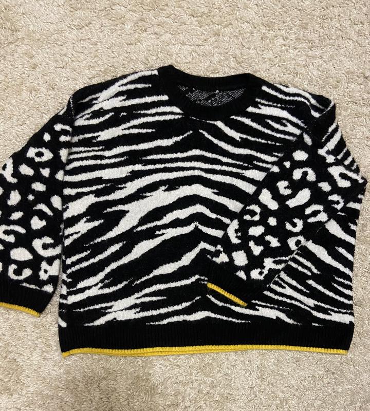 Дуже стильний і класний светр від zara з принтом зебра в дуже хорошому стані рукав опущений розмір s, оверсайз заміри: довжина 62см ширина: 63см довжина рукава від горловини 66см дуже стильно виглядає, класна якість