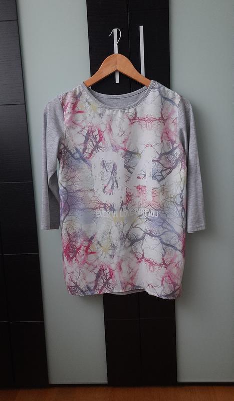 Кофта (лонгслів) з рукавами 3/4. Розмір L. Склад ззаді: 50% поліестер, 50% віскоза, спереді: 100% поліестер. Стан-хороший. Просьба орієнтуватись на заміри. Заміри: Побхват плечей 39см Побхват грудей 47см Побхват по низу 53см Довжина 66см Довжина рукава від плеча 42см
