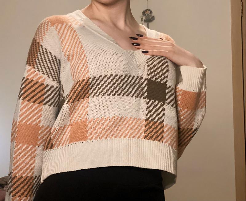 Укороченная кофта молочного цвета в крупную клетку и с декольте. Материал приятный к телу и не кашлатится.