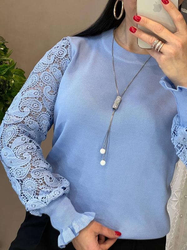 яскрава, стильна і комфортна кофта вільного крою з круглим коміром, на гумці внизу і високих манжетах, шикарними рукавами з приголомшливо гарного мережива на підкладці з прозорої сітки, виготовлена з приємного до тіла трикотажу дрібної машинної в'язки кофточка має чудовий вигляд на дівчатах з різними типами фігури, в ній затишно і легко, вона створить чудовий настрій і займе гідне місце у вашому гардеробі розмір єдиний 42-46 довжина 56-58 см н г 49-50 см, довжина рукава від шиї 68-70 см код 08 / 2129