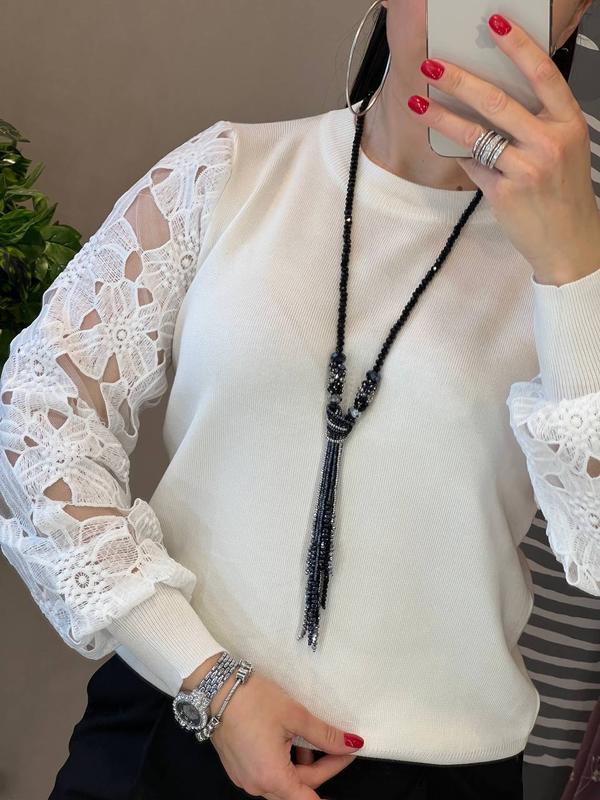 яскрава, стильна і комфортна кофта вільного крою з круглим коміром, на гумці внизу і високих манжетах, шикарними рукавами з приголомшливо гарного мережива на підкладці з прозорої сітки, виготовлена з приємного до тіла трикотажу дрібної машинної в'язки кофточка має чудовий вигляд на дівчатах з різними типами фігури, в ній затишно і легко, вона створить чудовий настрій і займе гідне місце у вашому гардеробі розмір єдиний 42-46 довжина 56-58 см н г 49-50 см, довжина рукава від шиї 68-70 см код 836-2 / 2102