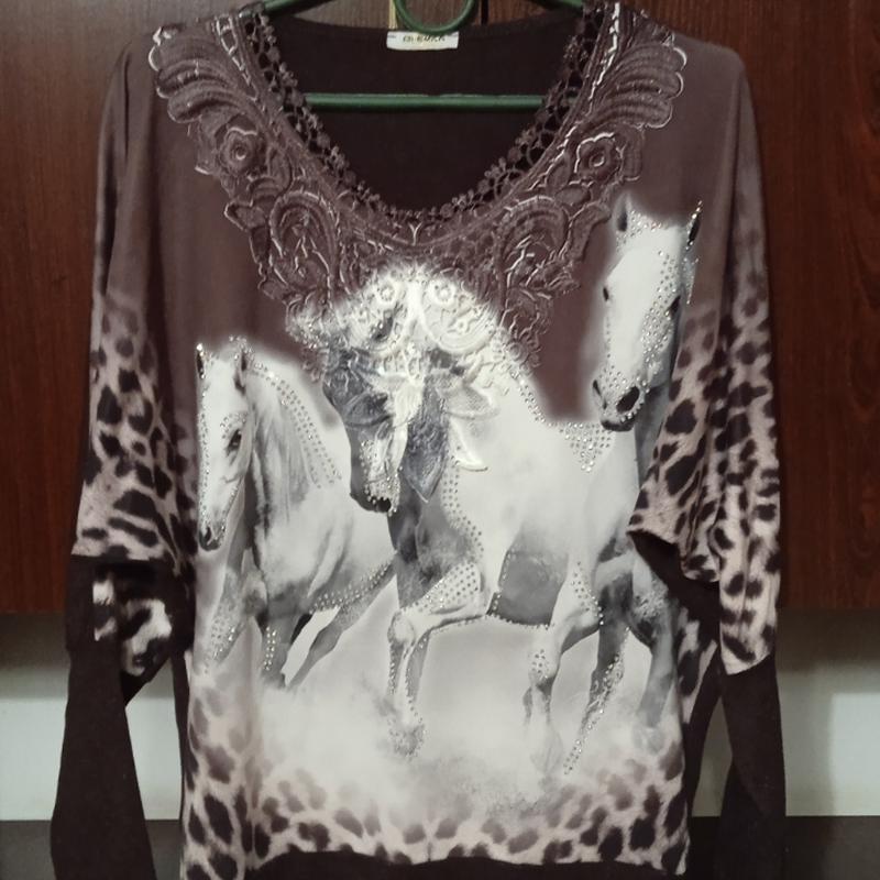 Кофта летюча миша. Имеет спереди камушки. Замер под руками 106 см, длина 64 см. Очень красивая.