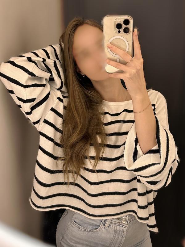 Укороченный трендовый свитер свободного кроя в черно-белую полоску Длина: 45 см Ширина: 70 см Рукав: 53 см