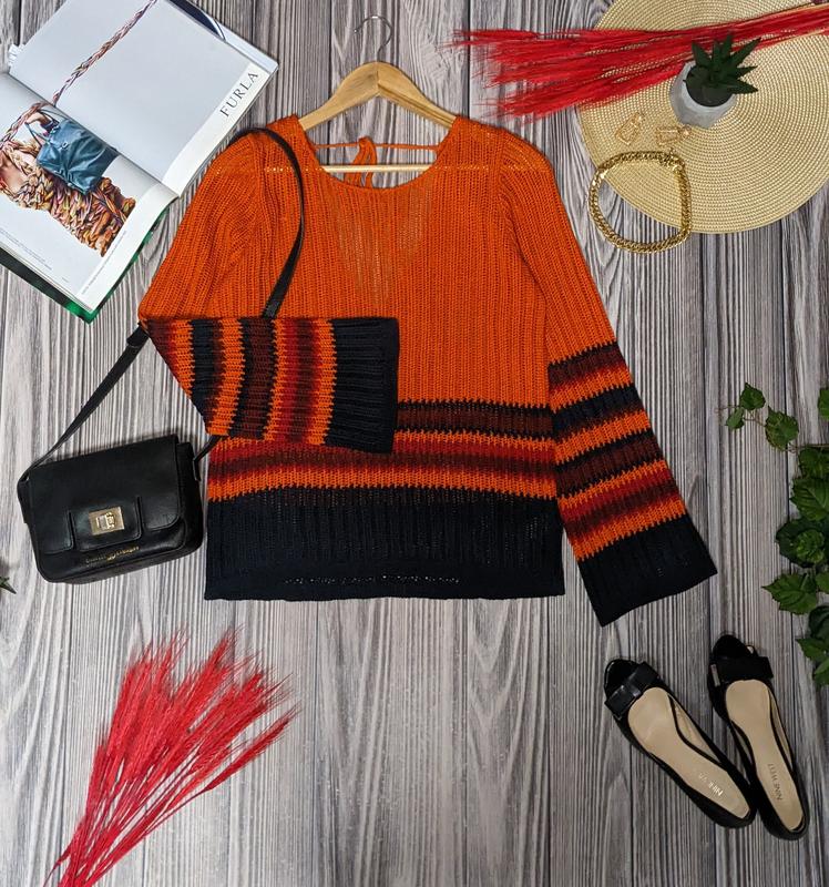 Доброго дня, для точного визначення підійде річ або ні, порівнюйте будь-ласка з вимірами своєї подібної речі, а не зі своїми об'ємами. Рекомендую перед замовленням прочитати інформацію в розділі "Про мене" це займе декілька хвилин Вашого часу але там багато корисної інформації 🫶 Неймовірний тонкий дуже якісний светр. Спереду круглий не глибокий виріз, по спинці V подібний рґвирвз, зверху зав'язується на шнурок. Рукав кльош. Светр з тонкої, не ворсистої нитки, фактурної, ажурної в'язки. Дуже м'який та приємний до тіла. Гарно тягнеться, злегка просвічується. Колір: Помаранчевий, Червоний, Темно-синій, Бордовий Принт : Смужка. Розмір по бірці: EUR 40-42 Стан: Новий (сток) Дефекти: Без дефектів Виміри зроблені в півобхваті. Довжина виробу від плеча 62см Довжина рукава від горловини 71см Довжина від пахви до низу 39см Ширина від плеча до плеча 40см(не зав'язаний) Висота пройми 25см Півобхват грудей 51см Півобхват талії 46см Півобхват низ 46см Ширина рукава зверху 16см Ширина рукава посередині 15см Ширина рукава знизу 18см Склад тканини : 92%Акрил, 8%Нейлон. Оплатити можна через Безпечну покупку або оплатити на карту Приватбанку. Доставка можлива Укрпоштою або Новою поштою. Бронювання на оплату тільки одна доба. Не забудьте ПІДПИСАТИСЬ щоб не пропустити новинки та розпродажі. Вдалих покупок 🌹