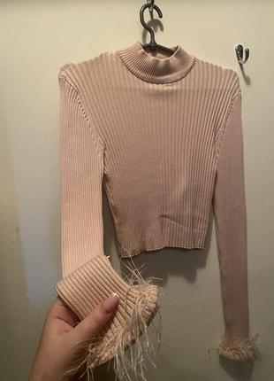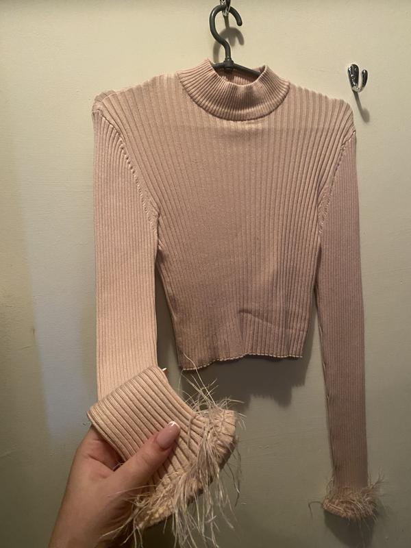 Кофтинка-топ з пір’ям від Amisu Нова. Розмір пише хл ,довжина 43. Ширина 33-60 полуобхват. Дуже приємний матеріал.