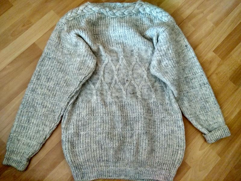 Дуже теплий в'язаний шерстяний светр. Пог 54 Довжина 84 Рукав 60+манжет Ширина знизу 42-61(гумка). Виміри зроблені в нерозтягнутому стані. Дуже добре тягнеться.