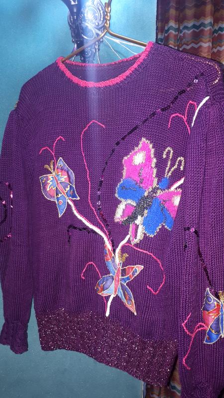 Вінтажний фіолетовий светр з метеликами аплікація мозаїка декор люрекс.