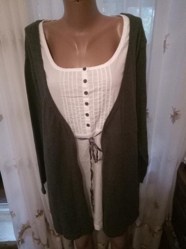 свитер-туника 2 в 1 из плотного трикотажа и хлопка, основная часть - кофтина серого цвета, длинный рукав, завязывается спереди на ленту, спереди вставка хлопковая имитация блузки, квадратный вырез горловины, декорирована пуговицами. НОГ 65см