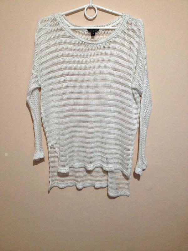 Свитер TOPSHOP паутинка. Размер: 10 (38) М. Красивейшая ажурная вязка, ажурные манжеты. Длина спереди: 65 см Длина Сзади: 74 см Рукав от горловины: 64 см ПОГ: 54 см Все замеры сделаны в спокойном состоянии. Свитер очень хорошо тянется. Без дефектов!