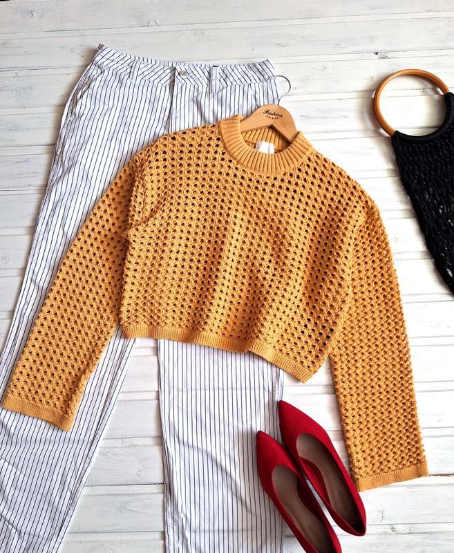Красивый свитер-сетка желтого цвета. ПОГ 50 ПОТ 51 Низ 49 Длина 43.5 Плечи 51 Рукав 57 Состав: 100% полиэстер