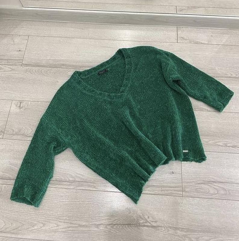 Стильный плетеный свитер от mohito/ Фасон свободный укороченный/ Плетение заводскее/ Подойдет на xs s m европейский ориентируйтесь по замерам/ Длина Плечи 61 см/ Рукав 27 см/ Пог 60 см/ Знизу 56 см/ Мягкий тип бархат. С нюансами-месцами зацепки, фото указано, тем более цена ниже/ Можно носить типа стиль «balenciaga” Или использовать нити из него/ Продается без возврата.