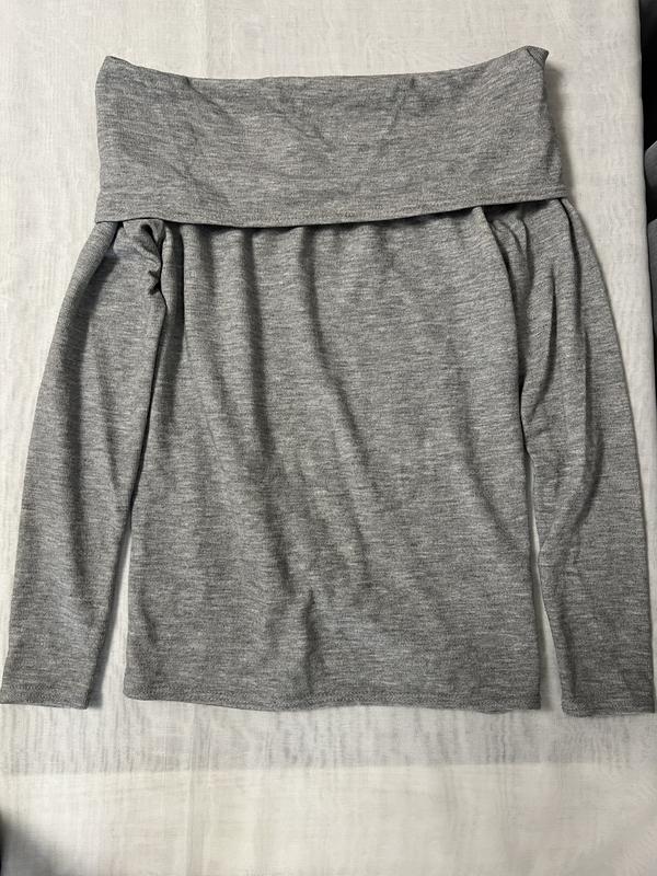 Серая кофта, с обнаженными плечиками.