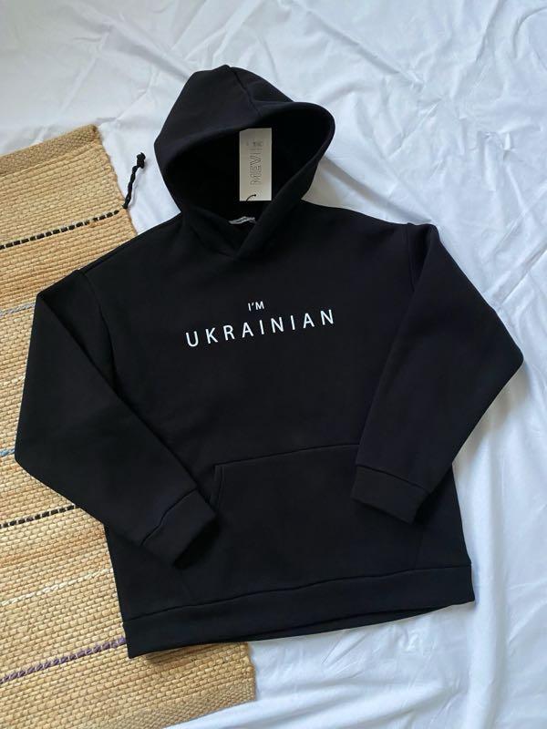 Тип одягу: Худі Утеплений та затишний худі чорного кольору 🖋️ На грудях надпис •i'm ukrainian• на спинці зображений тризуб Розмір: m Довжина: 66 см Півобхват: 58 см Плечі: 54 см Рукав від плеча: 53 см