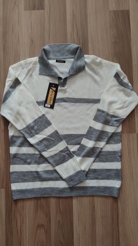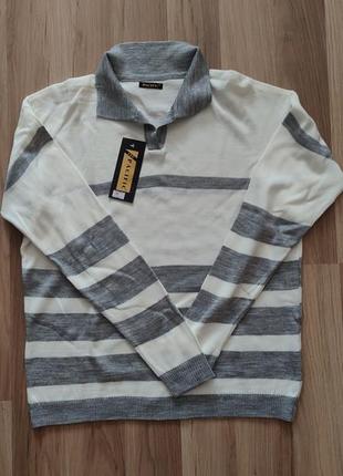Кофточка с воротничком поло. новая, стильная. Цвет серый и белый. отлично подходит как под джинсы так и под брюки. Новый. размер M. Производитель Турция. Замеры Длина 62 см ПолуОбхват грудь 50 см Рукав от плеча 55 см. Плечи низкие свободный крой.