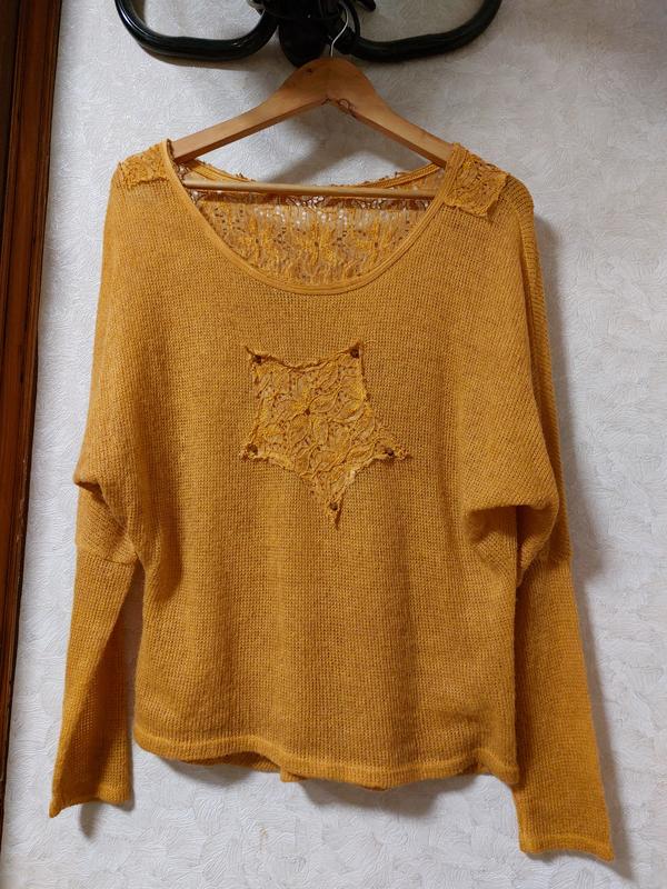 Итальянский, тонкий, легкий свитерик с ажурной спинкой, рукав реглан. Классный дизайн, состояние отличное. Состав на последнем фото-95% шерсть! Оверсайз Замеры: от горловины до низа рукава 73, полуобхват груди 53, полуобхват по низу 47+. Тканина тягнеться.