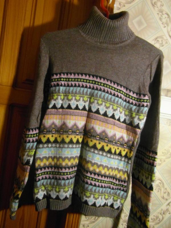 Симпатичный коричневый с узором свитер с воротником в отличном состоянии, бирки срезаны, мягкий ,приятный к телу ,тянется. На ощупь хлопок + вискоза . Смотрите замеры: длина- 60 см, длина рукава-66 см , ПОГ-45 см. ПО низа -45-55 см (резинка)