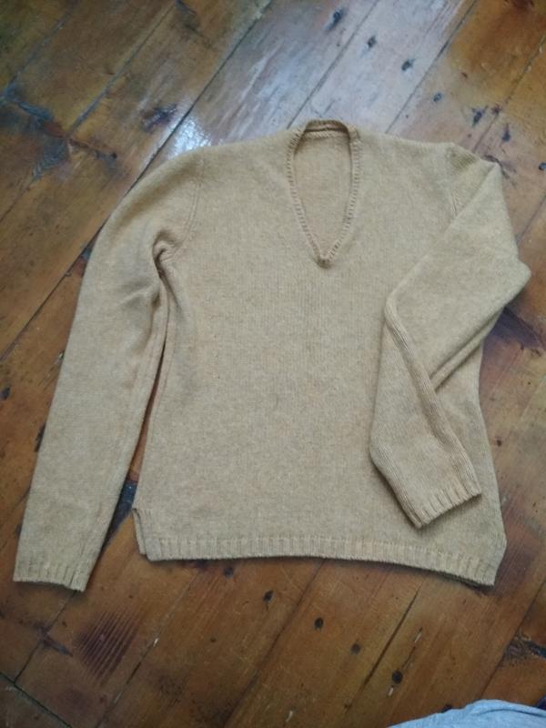 Очень крутой свитер цвета кукурузы, по бокам разрезы, V- образный вырез. Размер не указан, идёт на S.