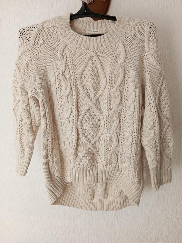 мягкий свитер с косами пол обхват груди 48 длина спереди 57 сзади 68 рукав от горловины 67 укороченный указан размер 152 подойдет на s XS m