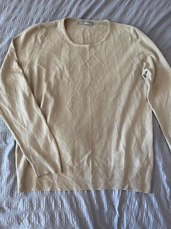 Невероятно мягкая и гладкая базовая кофточка, 100% акрил, цвет - беж, размер L, отлично стилизуется как М оверсайз ( классическая прямая кофта). Есть незаметный дефект на рукаве ( фото добавлены)