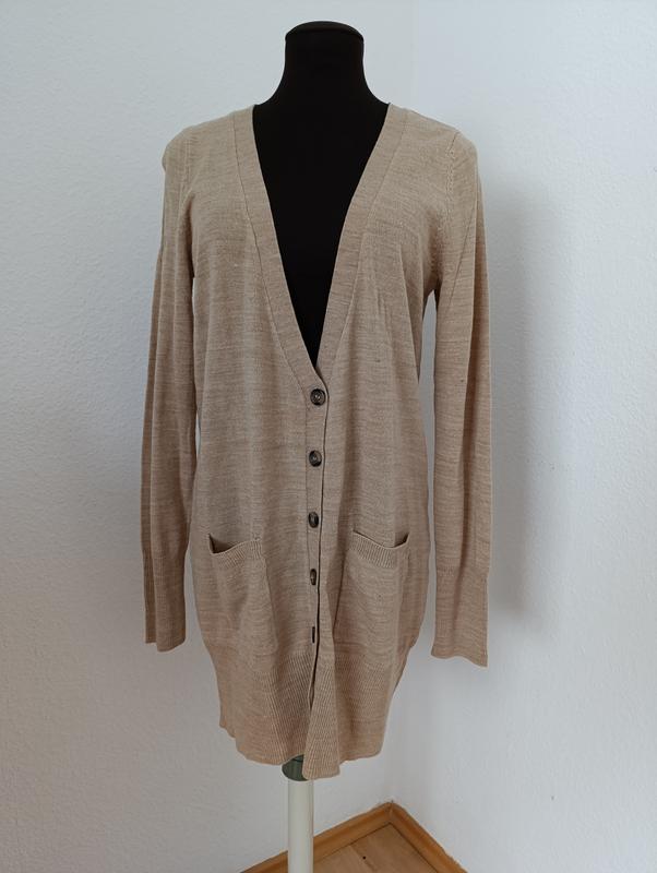 Удлиненный свитер кофейного цвета. Ширина плеч 36, длина рукава 68, длина изделия 84.