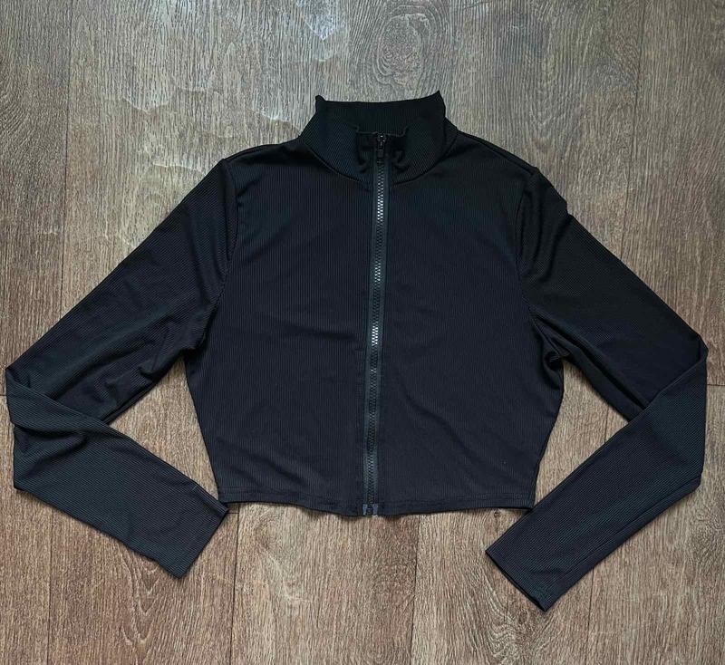 Кроп кофта укороченная на молнии фирмы Shein, размер М, длина 41 см, полуобхват груди 41 см, длина рукава 60 см, ткань в рубчик, хорошо тянется