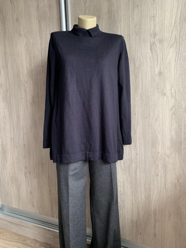 Шерстяной брендовый свитер,свободный,цвет темно синий,воротник, мягкий и приятный на ощупь, в красивом состоянии. Плечи 38см Полу объем под руками 51см Полу объем по низу 69см Длина рукава 58см Длина изделия 71см Доставка: Отстираю новой и Укр-почтой после полной оплаты на карту