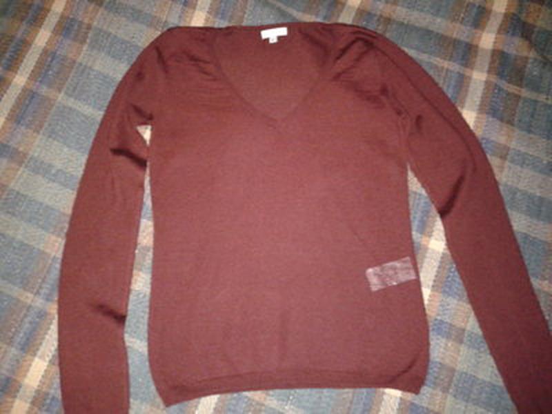 Свитерок в очень хорошем состоянии. Не заношен, не затерт. Без катышек, без зацепок. Подмышки абсолютно чистые. Внешне выглядит мало ношенным. Состав 50% шерсть (меринос), 50% акрил. Тоненький трикотаж. Вязка качественная, ровная. На просвет трикотаж даже просвечивается. Цвет на бирке баклажан. По мне ближе к цвету вяленой вишни. Свитерок не длинный, прямой. Вырез V-образный, не глубокий. Рукавчик узенький в обтяжечку. Поддеть под свитерок что-либо не получится. Тонкий и в обтяжку. И проймы не глубокие. Спереди примерно в талии и ниже с обеих сторон симметричные ажурные диагональные полосы. На фото подложила белый лист, чтобы было видно. Размер на бирочке С, но маломерит, на ХС. У меня параметры 82-70-92, рост 165. Сидит идеально в обтяжку везде. примерно на такие параметры. Замеры: - длина по спинке - 52 см, - плечи - 33,5 см, - от подмышки к подмышке - 39,5 см, - по низу - 35 см, - рукав - 61 см. Замеры в разложенном соcтоянии. Тянется умеренно.